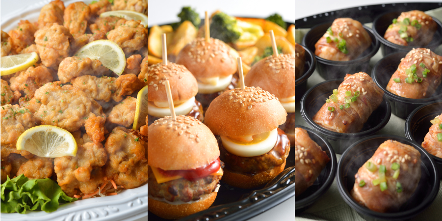 ジューシーな唐揚げや、ミニバーガー、肉巻きおにぎりなどの温製料理は、