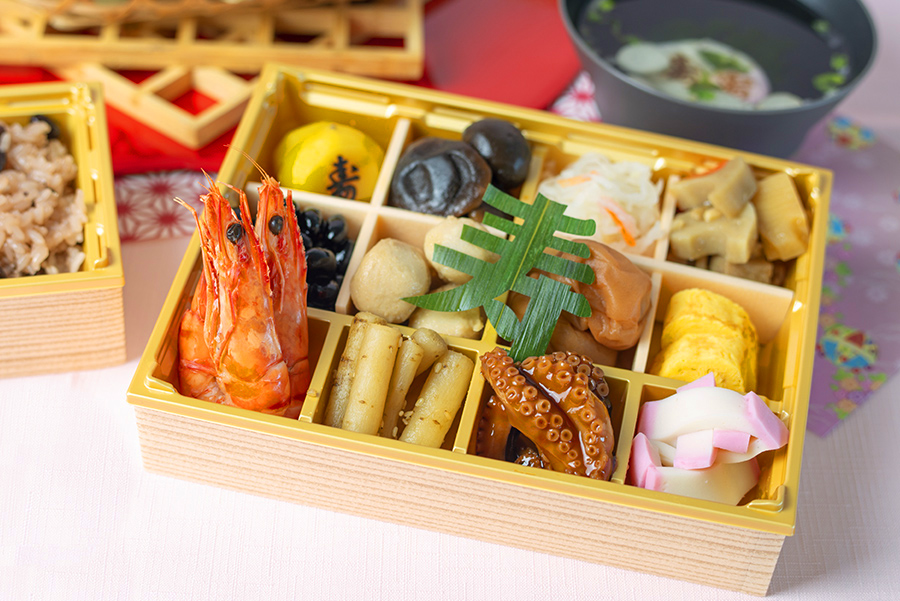 15品(祝い鯛・寿栗・黒豆・椎茸旨煮・里芋煮・卵焼き・蒲鉾・海老塩焼き・筑前煮・紅白なます・梅干し・牛蒡・蛸・赤飯・蛤汁)