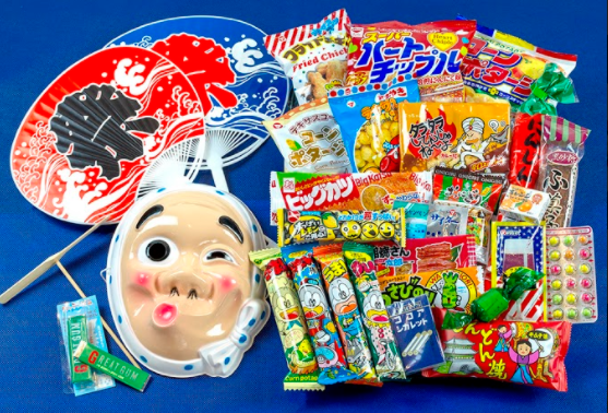 ひょっとこのお面・駄菓子・玩具等、昔懐かしいグッズもセットでお届けいたします。